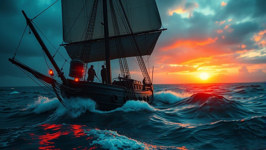 A striking picture of a pirate ship sailing on a stormy sea. The ship is rendered with vivid colors and ultra-realistic details, with a sad atmosphere and cinematic lighting.