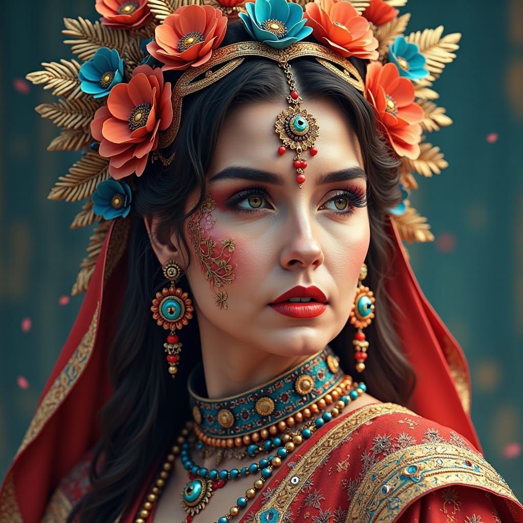 This image shows a hyperrealistic portrait of a beautiful woman adorned with colorful clothing and futuristic jewellery. The digital painting features intricate details and complementary colors.