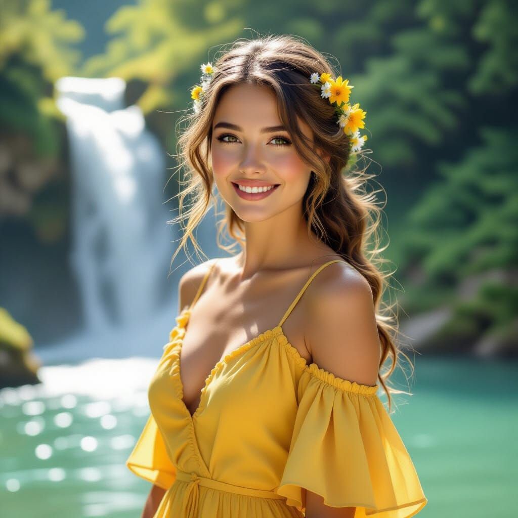 A beautiful woman with flowing blonde hair adorned with wildflowers smiles serenely before a waterfall, wearing a pale yellow dress. Hyperrealistic details and ethereal light create a dreamlike scene, in an art nouveau style.