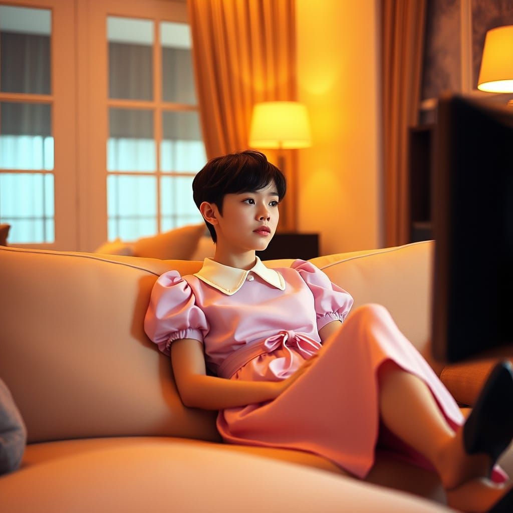 A young adult male in a cozy living room setting, dressed in a white blouse and pastel pink dress, reclines on a plush couch, lost in a TV screen's glow, captured in a 35mm film aesthetic with vibrant colors and soft textures.