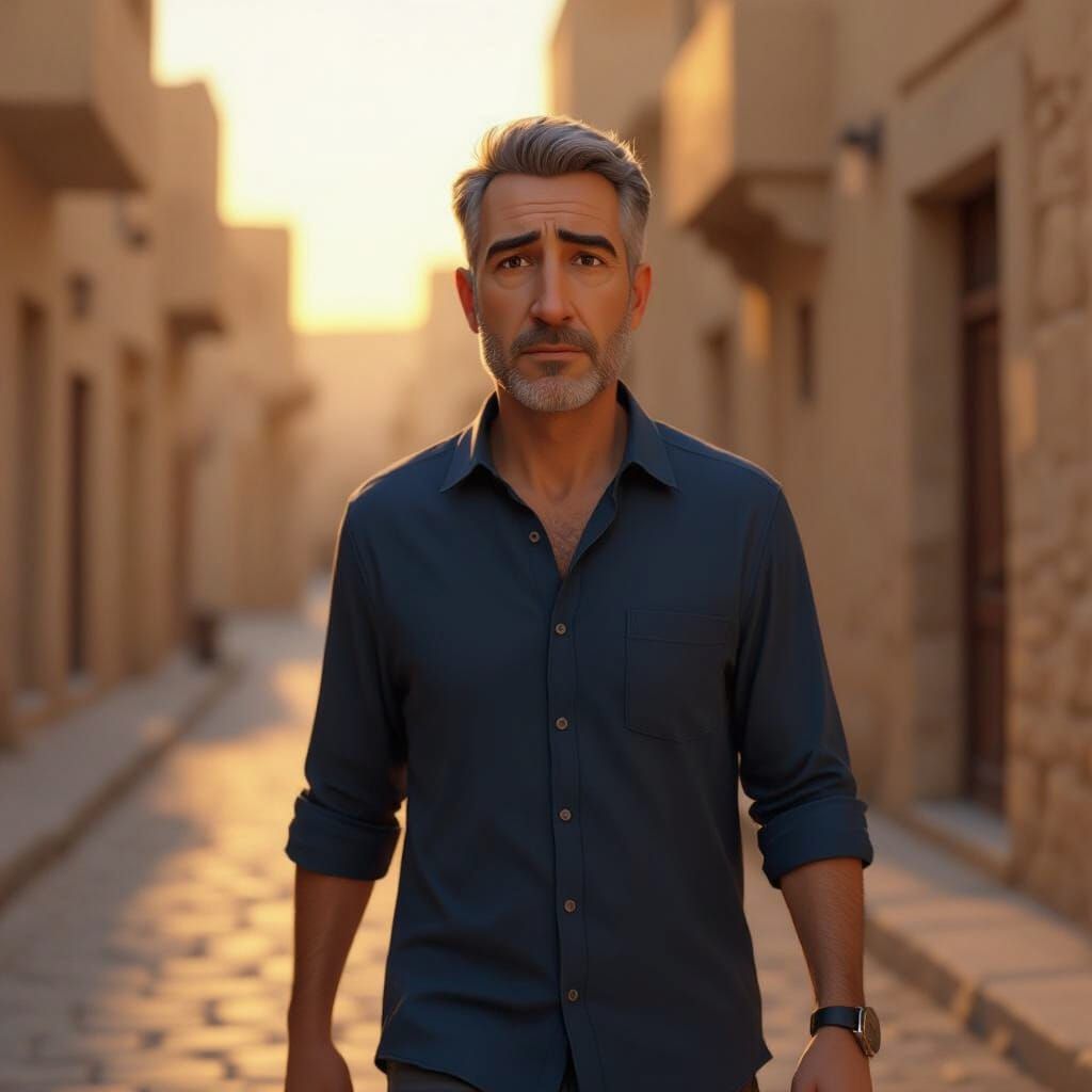 A cinematic 3D animation shows a man walking through an old Middle Eastern city at sunset, with warm golden light on stone walls. Rendered photorealistically with emotional lighting.