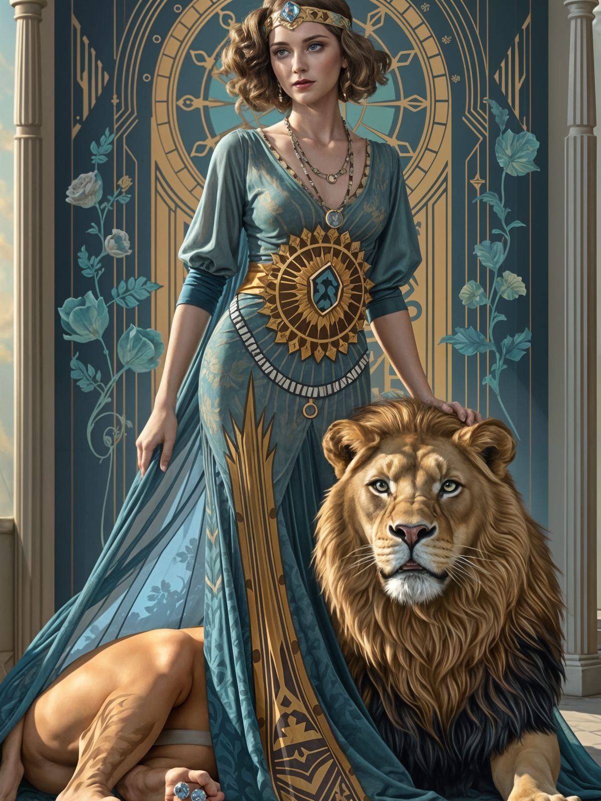 This image shows a reimagined Death tarot card in an art deco style. It features a flapper woman with a lion and a geometric floral border in a hyperrealistic digital illustration.