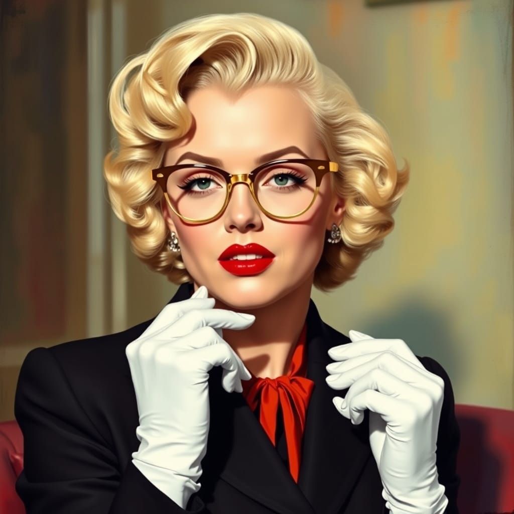 This image shows Marilyn Monroe as Pola Debevoise in a 1950s style outfit, complete with cat-eye glasses and white gloves. The artwork is reminiscent of classic American illustration with vibrant colors.