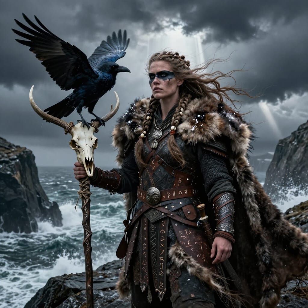 A powerful Viking shaman with war paint stands on a cliff, a raven on her arm, overlooking a turbulent northern sea under churning storm clouds. She holds a ritual staff topped with a deer skull.