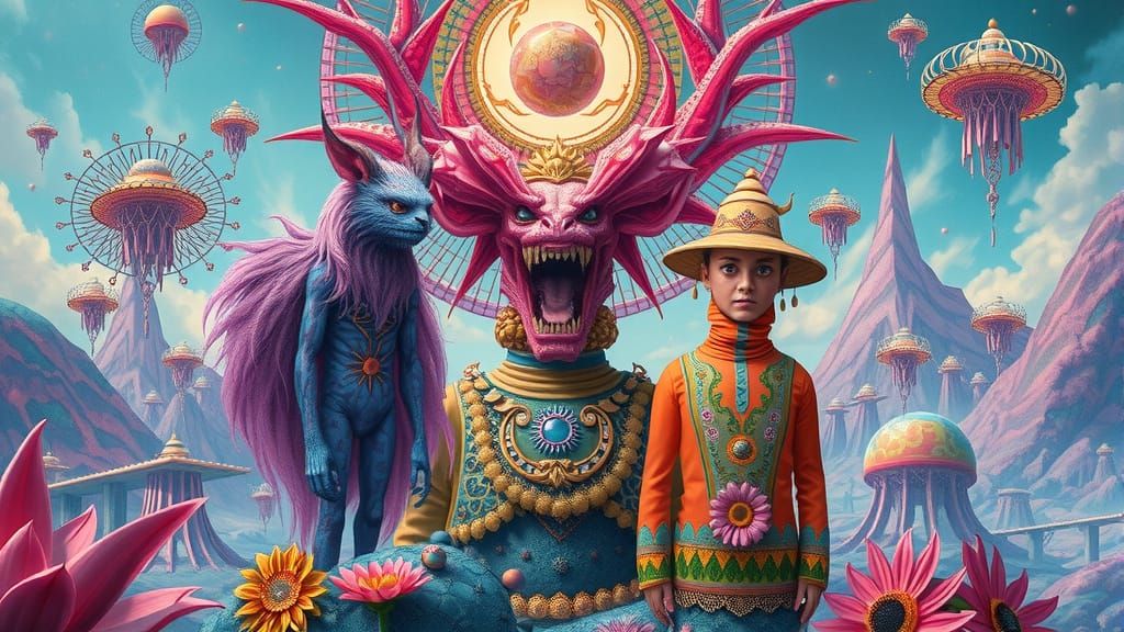 A surreal image showing iridescent creatures surrounded by fantastical plant mandalas and geometric structures. This psychedelic painting features intricate details and imaginative composition.