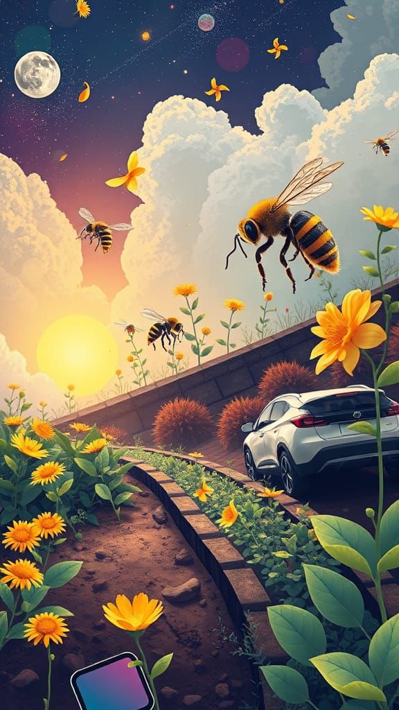 A vibrant image shows a futuristic garden scene where technology and nature blend seamlessly. Robotic bees pollinate, smartphones grow from the earth, and electric cars cruise along solar-powered paths.