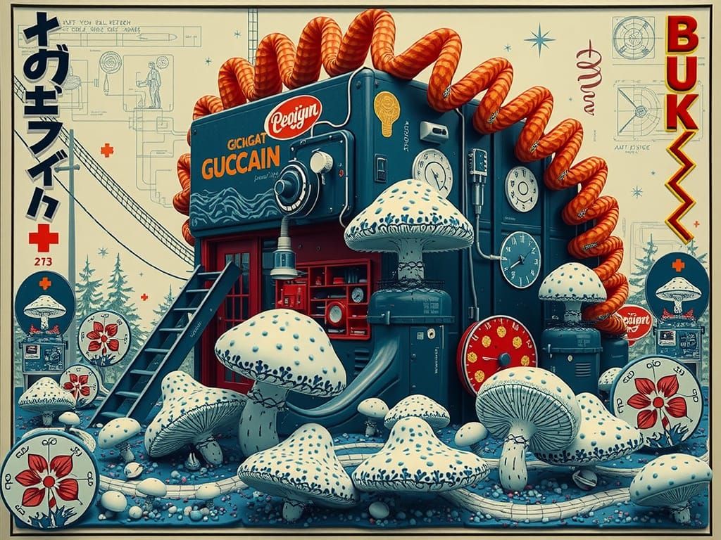 This vibrant sculpture combines modernist architecture with industrial machinery and surreal, playful elements, set amidst a whimsical forest of giant mushroom flags and intricate prints, evoking a nostalgic sense of wonder and commentary on the union of nature and technology.