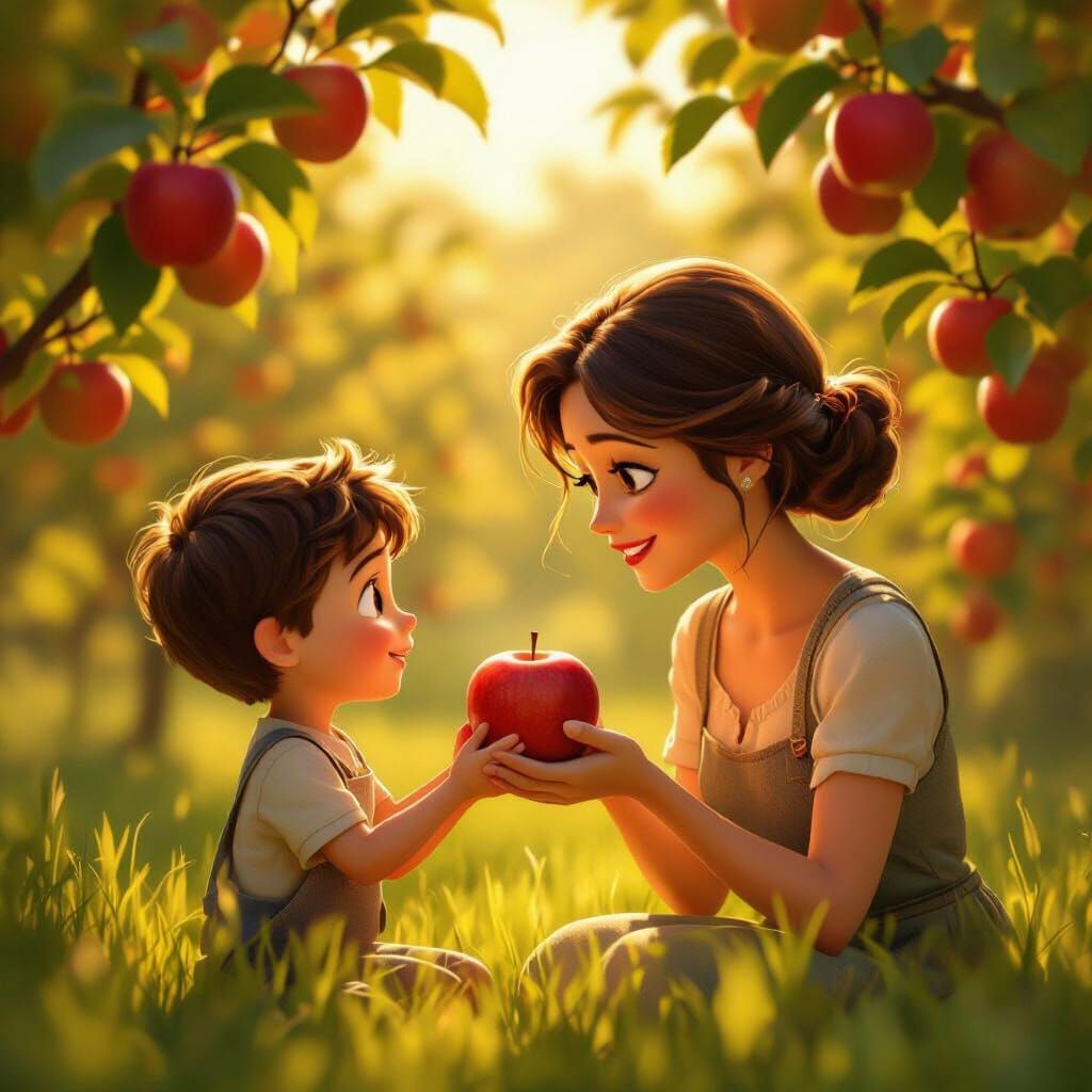 A heartwarming 3D render in Pixar animation style shows a young boy offering an apple to his mother amidst a sunny orchard. The scene radiates warmth and family affection with rich, inviting colors.