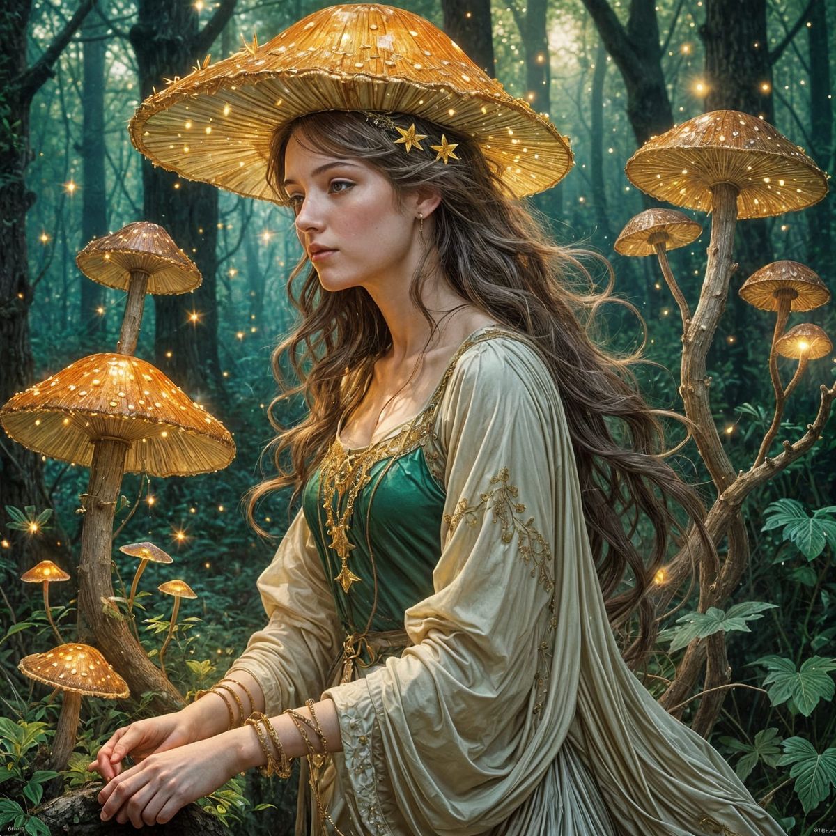This oil painting depicts a whimsical magical girl on a glowing mushroom in an enchanted forest. Ethereal lighting and vibrant colors create a dreamlike atmosphere.