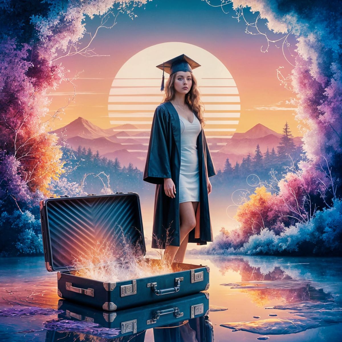 This image shows a woman in graduation attire beneath a vibrant sunset. An open suitcase beside her spills swirling colors, enhancing the magical, impressionistic watercolor scene and tranquil atmosphere.