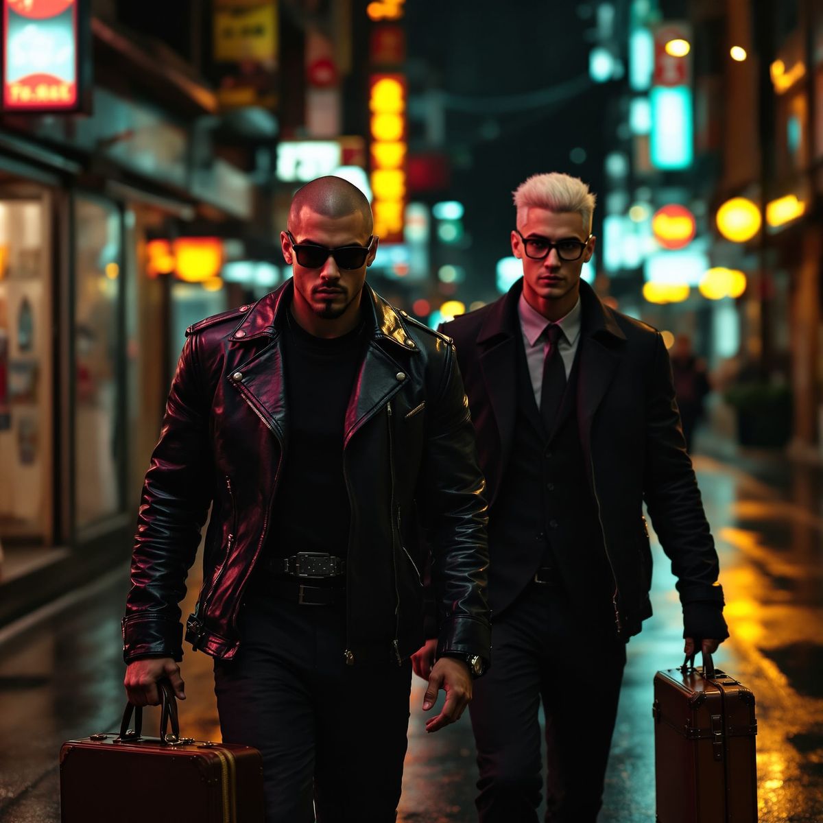 This image shows two men walking through a city at night. One man is dressed as an athlete in a leather jacket, while the other carries a briefcase. The photograph is in a cinematic style with bokeh effects.