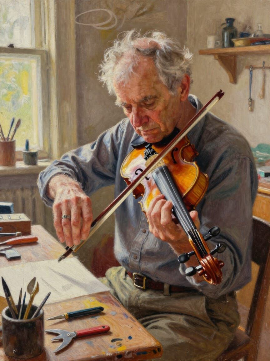 This image depicts an elderly man intently tuning a violin amidst scattered tools in a bright, sunlit workshop, rendered in a vibrant, hyperdetailed expressionist style.