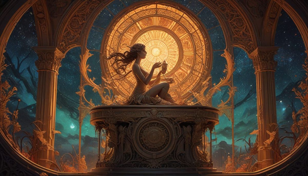 A mesmerizing image shows an antique music box projecting holographic images of celestial beings. The scene is filled with swirling colors and ethereal light, rendered with hyperdetailed precision.