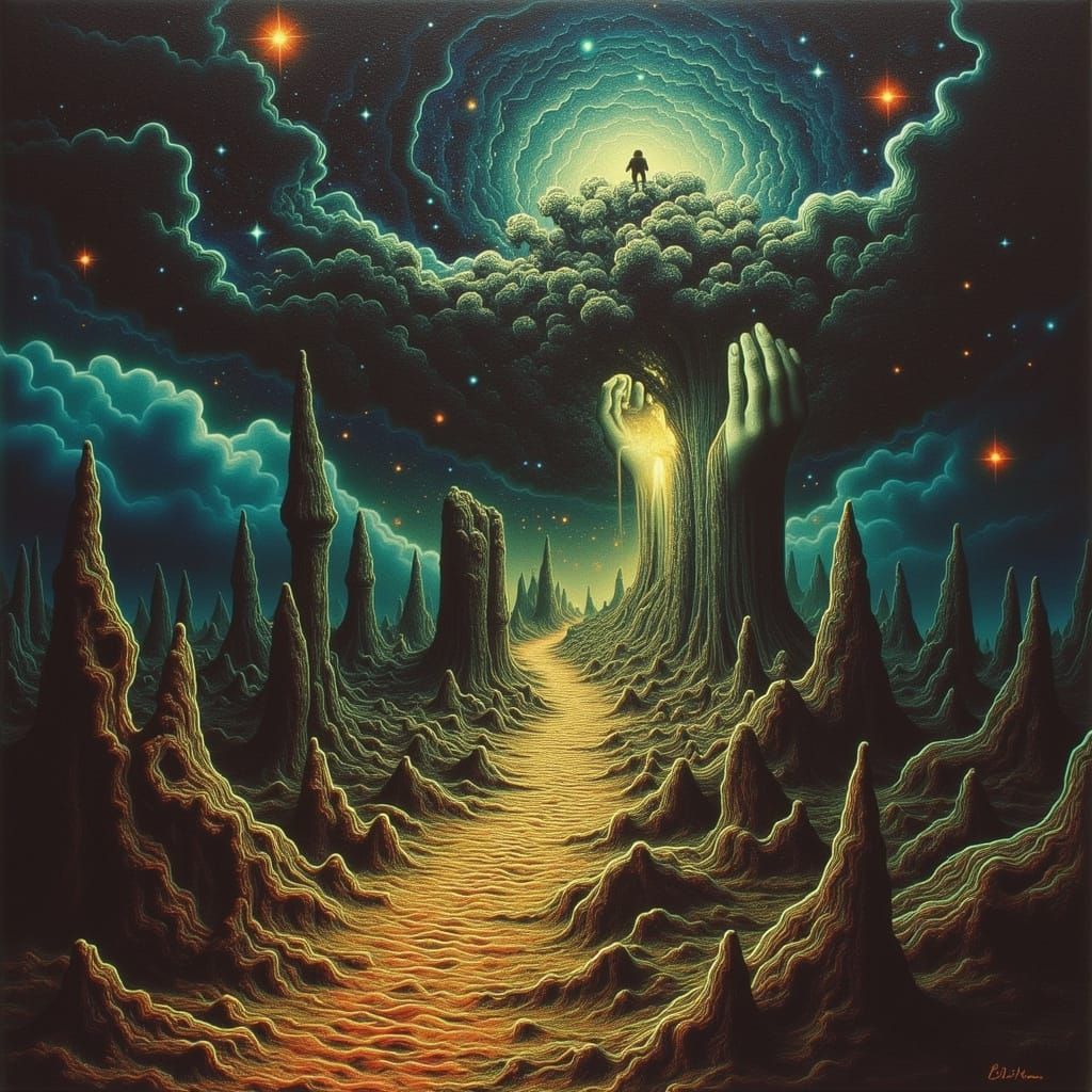 Don't go down the darker ways. Nothing can take away the love in your heart, and love is alive. You are alive. Stay on the path paved with love. Intensely surreal imagery and atmosphere, glitches in one's interface with reality, hypnagogia, clarity within distortion, liminal, cosmic, a mixture of 20th ...