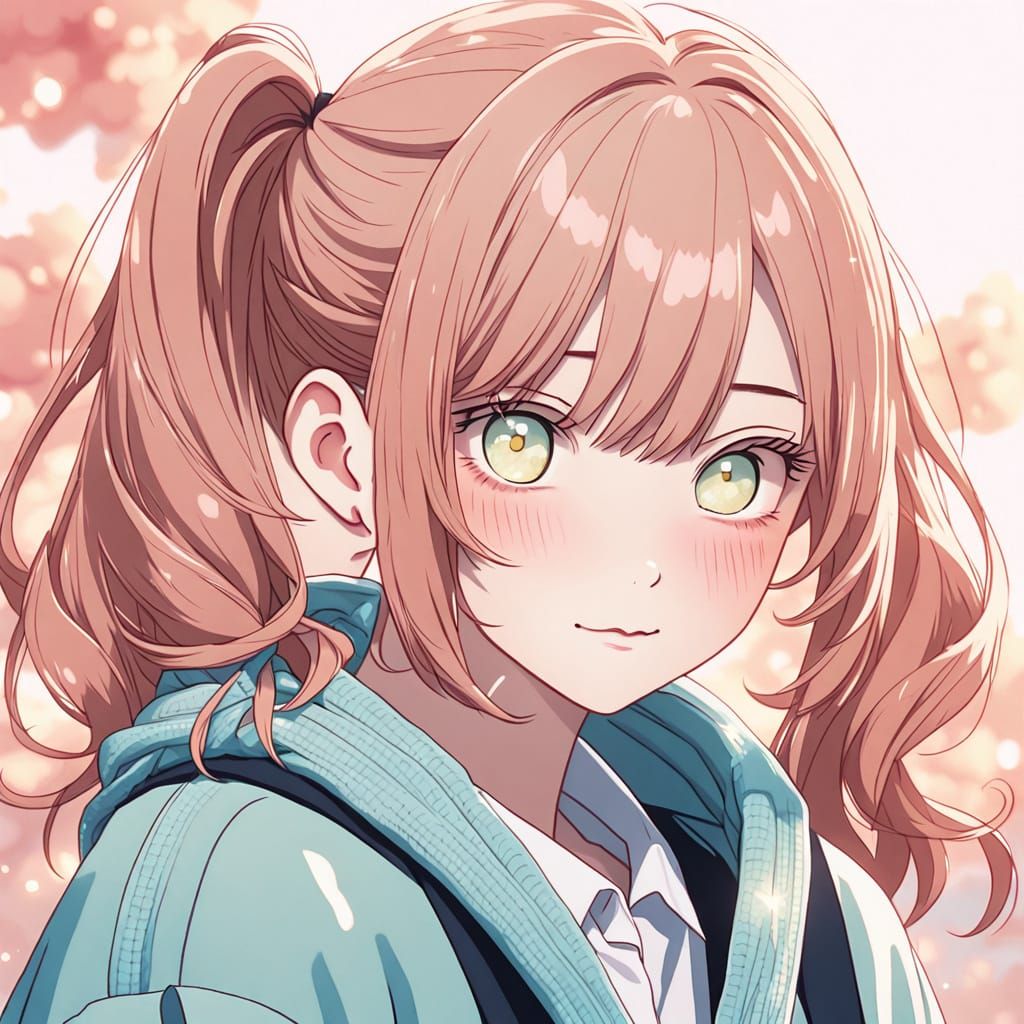 This image is a vibrant anime portrait of a high school girl with curly brown hair and bright hazel eyes, wearing an oversized cardigan over her school uniform, set against a soft pastel background with a gentle texture.