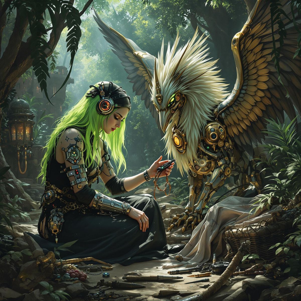 This image shows a gothic dieselpunk medic caring for a wounded clockwork hippogriff. The scene, set in a jungle clearing with ruins and steam-powered vehicles, has a dark fantasy aesthetic.