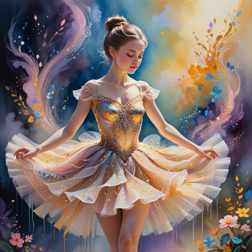 This enchanting image shows a delicate ballerina dancing on a mystical stage surrounded by swirling mist and vibrant, kaleidoscope colors. Painted in a dreamy, ethereal style with soft, golden lighting and dynamic shadows, this impressionist masterpiece is a testament to the magic of art.