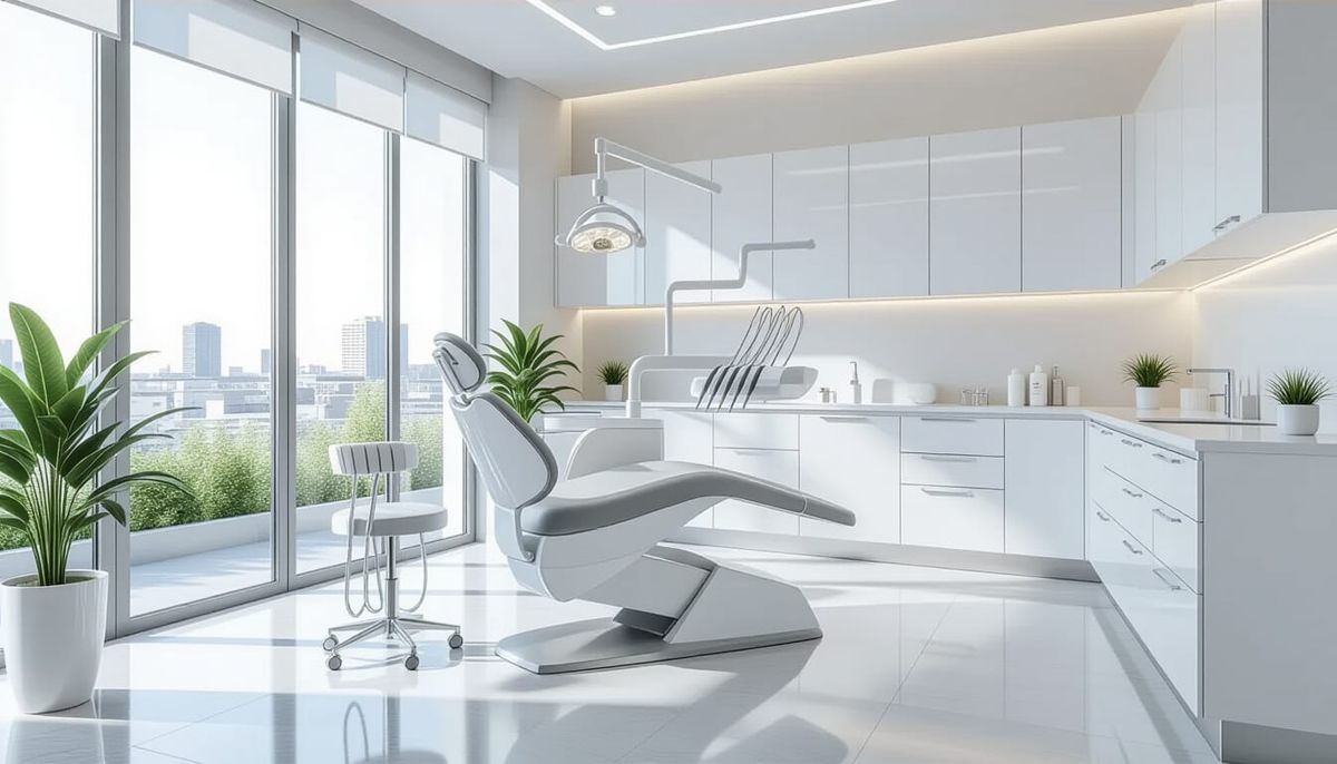 This image showcases a bright, elegant, and minimalist dental clinic interior in Tehran, featuring modern equipment, natural daylight, and a welcoming atmosphere. Photorealistic wide-angle shot.