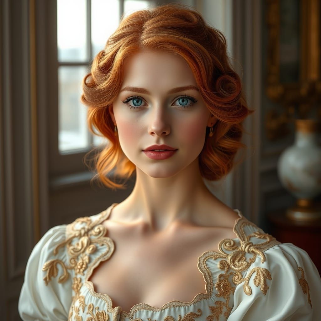 This image features a serene, photorealistic portrait of a stunning redhead woman in a beautiful, intricate Victorian-era dress, set against a soft, natural light background with detailed textures and subtle undertones reminiscent of a classic masterpiece.