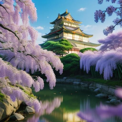 A stunning photograph captures Osaka Castle surrounded by blossoming wisteria, orchids, and bamboo. The image features a warm, golden hour glow and a soft, dreamlike quality in a Japanese aesthetic.