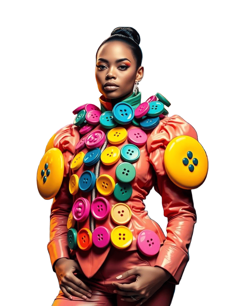 A vibrant, high-fashion model poses in a surreal dreamscape, surrounded by a melting backdrop of urban streets, neon-colored buttons, and bold graffiti art, evoking the styles of pop art masters with a neon-lit glow and ultra-detailed textures.