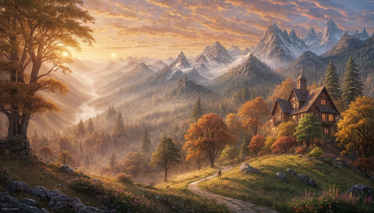 A breathtaking sunrise featuring red and gold colors with ethereal mist. This image evokes a hyperdetailed fantasy landscape, reminiscent of luminist paintings.