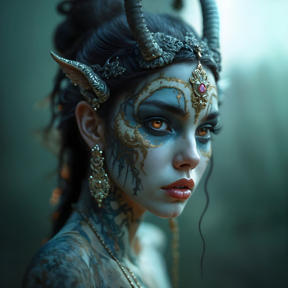 This highly detailed 4k photograph showcases a beautiful female demon made of polished chromium, featuring intricate ivory carvings, bone details, and vibrant tattoos, bathed in a soft blue glow. The image has a shallow depth of field and bokeh, with cinematic color grading.