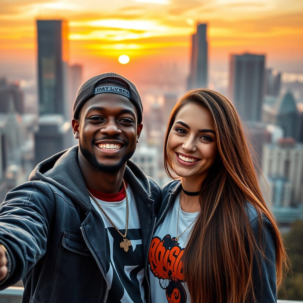 This image captures a heartwarming moment of friendship between two friends, an African American man and his Caucasian female best friend, as they take a playful selfie in front of a stunning cityscape at sunset, blending the spontaneity of a Henri Cartier-Bresson snapshot with the vibrant colors and tex...