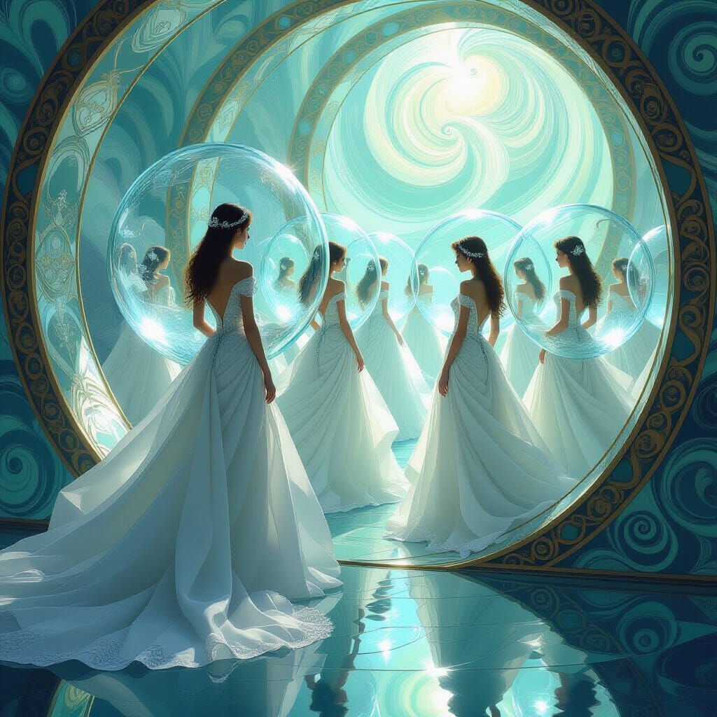 This image showcases ladies in delicate glass gowns inside glowing orbs, set against a swirling abstract background. Rendered with fine detail and soft light, it evokes a surreal, dreamlike quality.