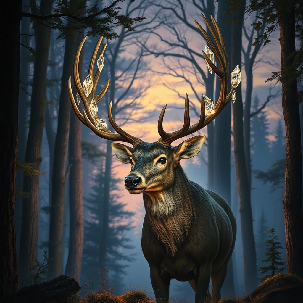 A striking picture of a stag silhouetted in a twilight forest. Its antlers are decorated with glowing crystals in a detailed matte painting style with deep colors and intricate details.