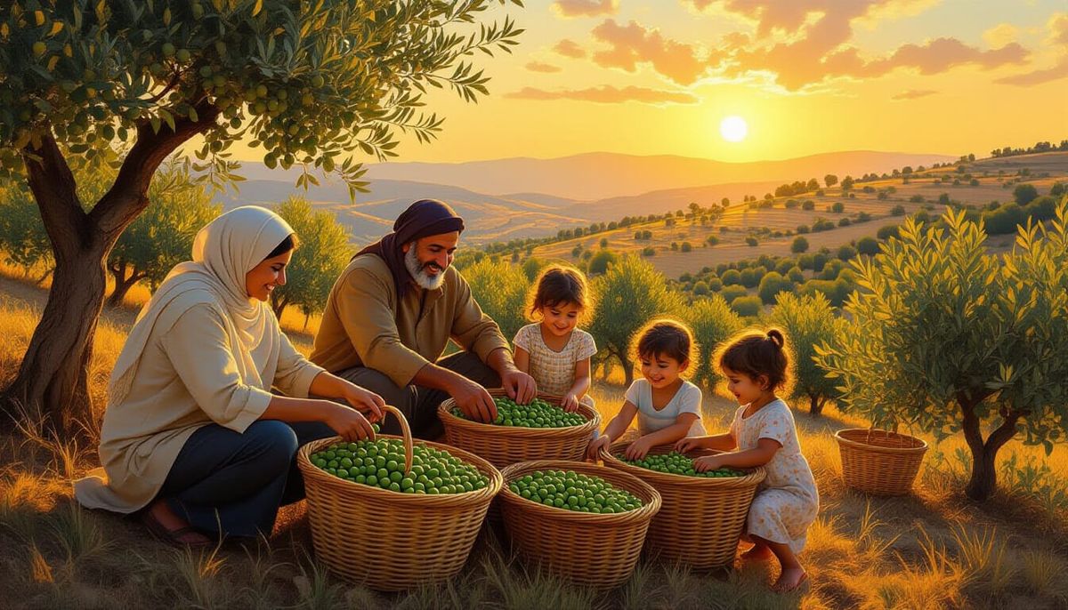 This image shows a large Palestinian family happily picking olives during golden hour. The detailed oil painting captures their smiling faces and the vibrant hues of the setting sun, with children playing amongst the harvest.
