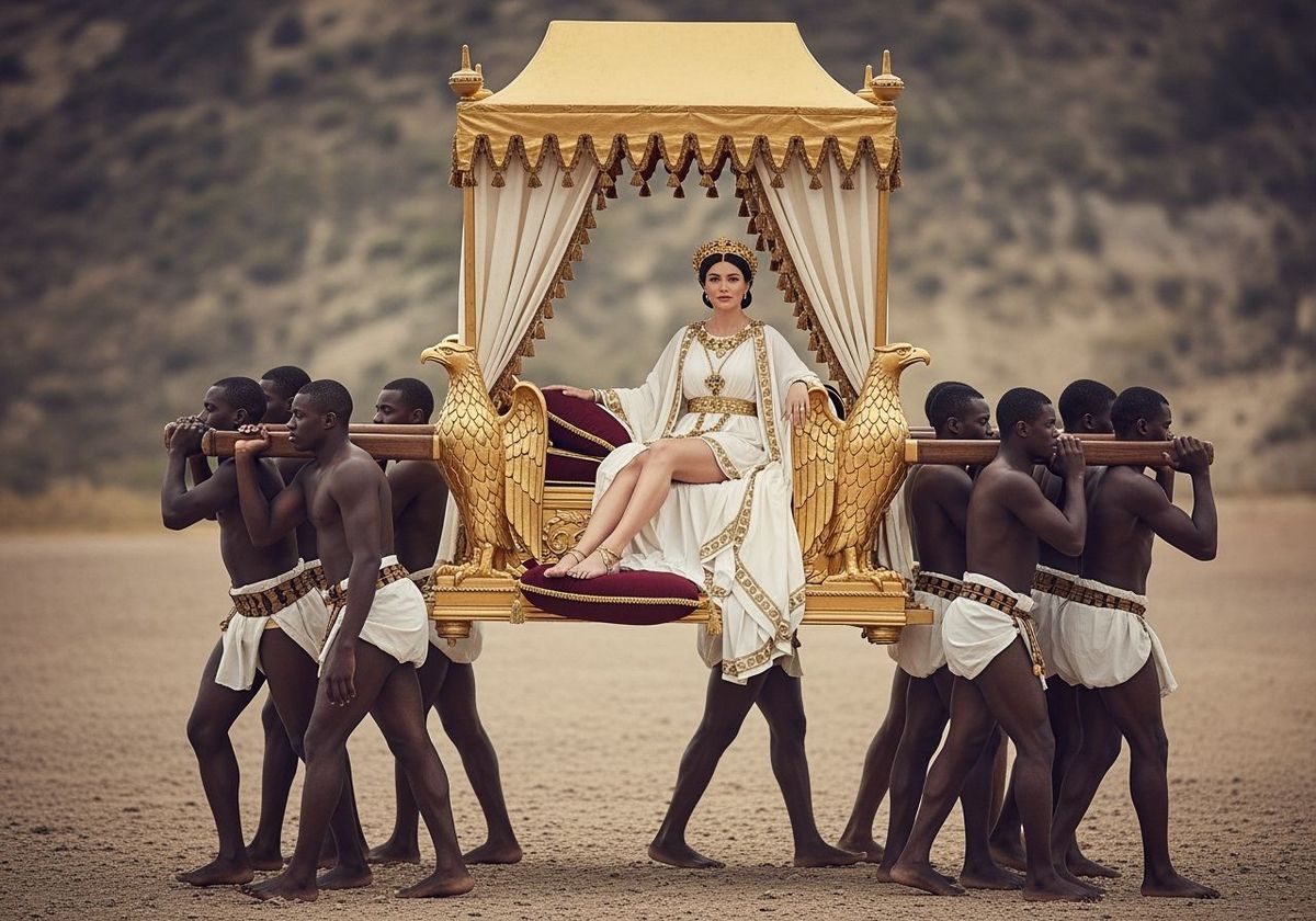This image shows a Roman Empress on a gold, eagle-shaped throne carried by servants. She wears a white toga with gold details and rests her feet on pillows. The scene has a soft focus, reminiscent of high-fashion photography.