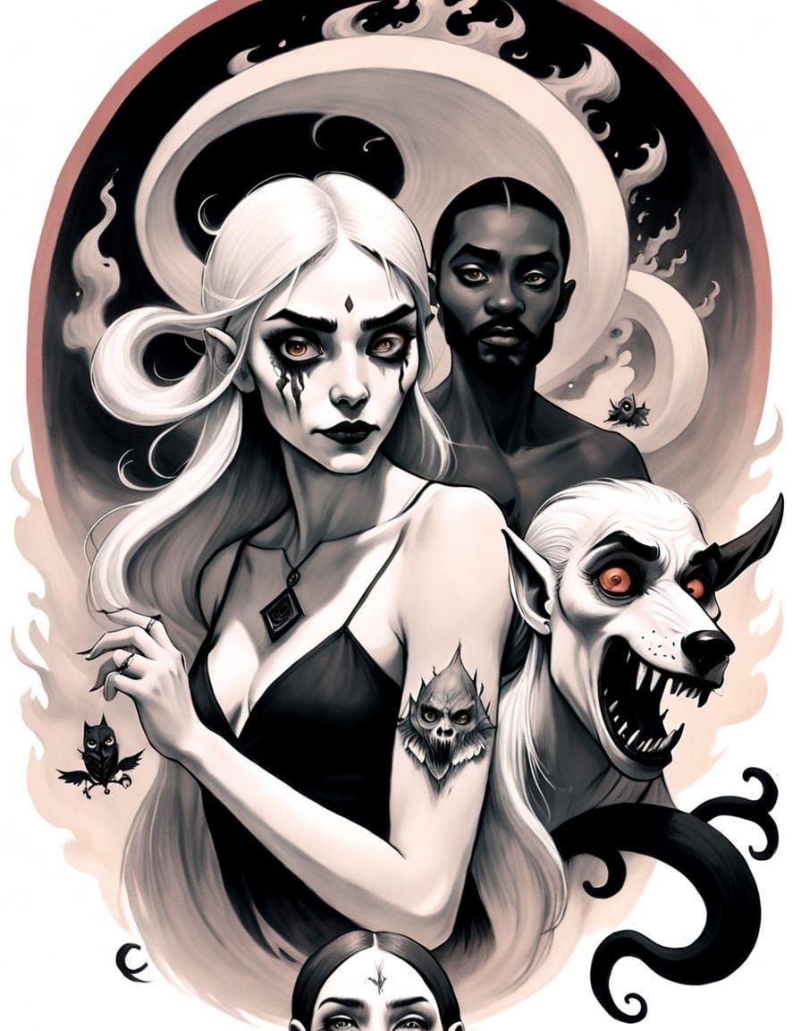 This image shows a mysterious woman with dark skin and white hair flying through the air, surrounded by a moody, mystical atmosphere. Inspired by charcoal drawing techniques and monochromatic post-impressionism, this dark fantasy artwork features detailed line work and a sense of movement and energy, rem...