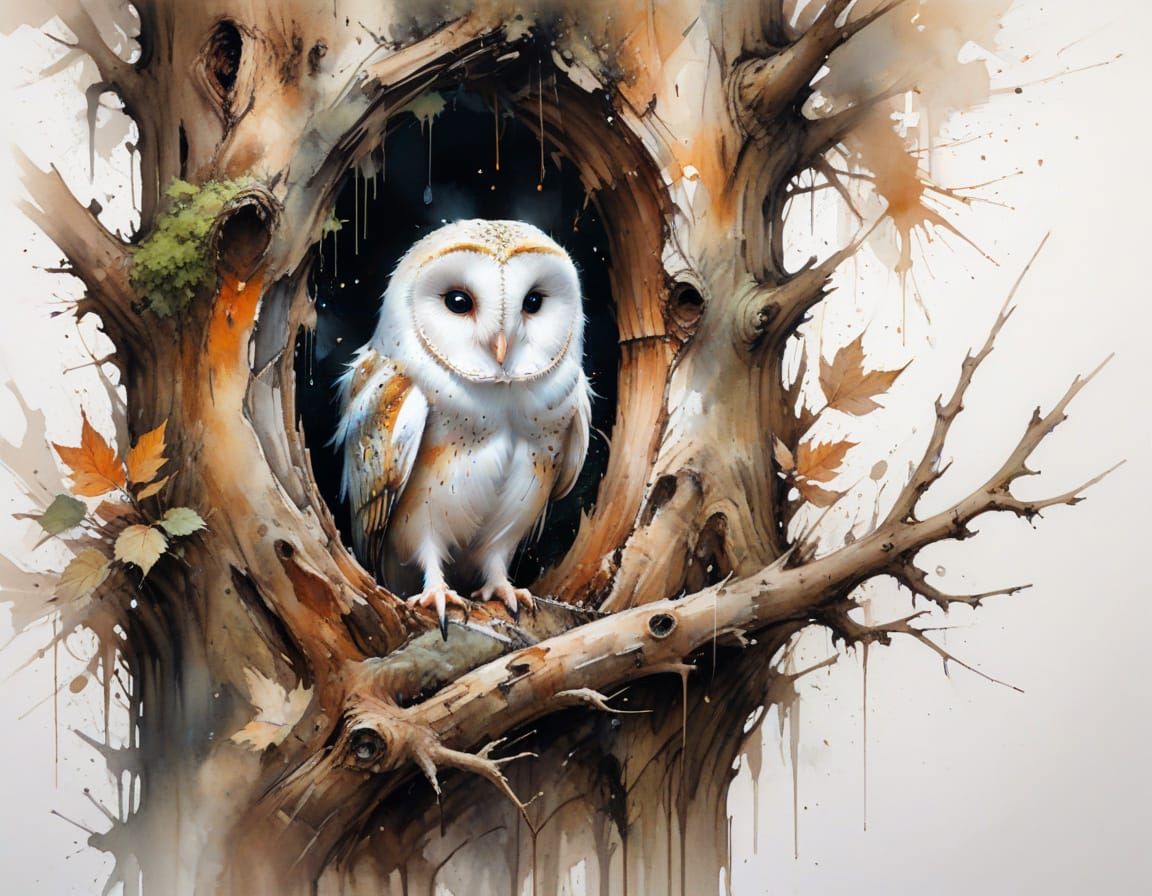 This image shows a wide-eyed baby barn owl peeking from an old oak tree hollow. Rendered in a soft watercolour style with muted earth tones and a blurred background.