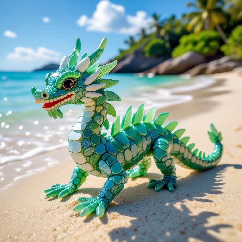 This image features an intricate sculpture of an Asian sea dragon crafted from numerous translucent, frosted sea glass pebbles, resting on a tropical beach.