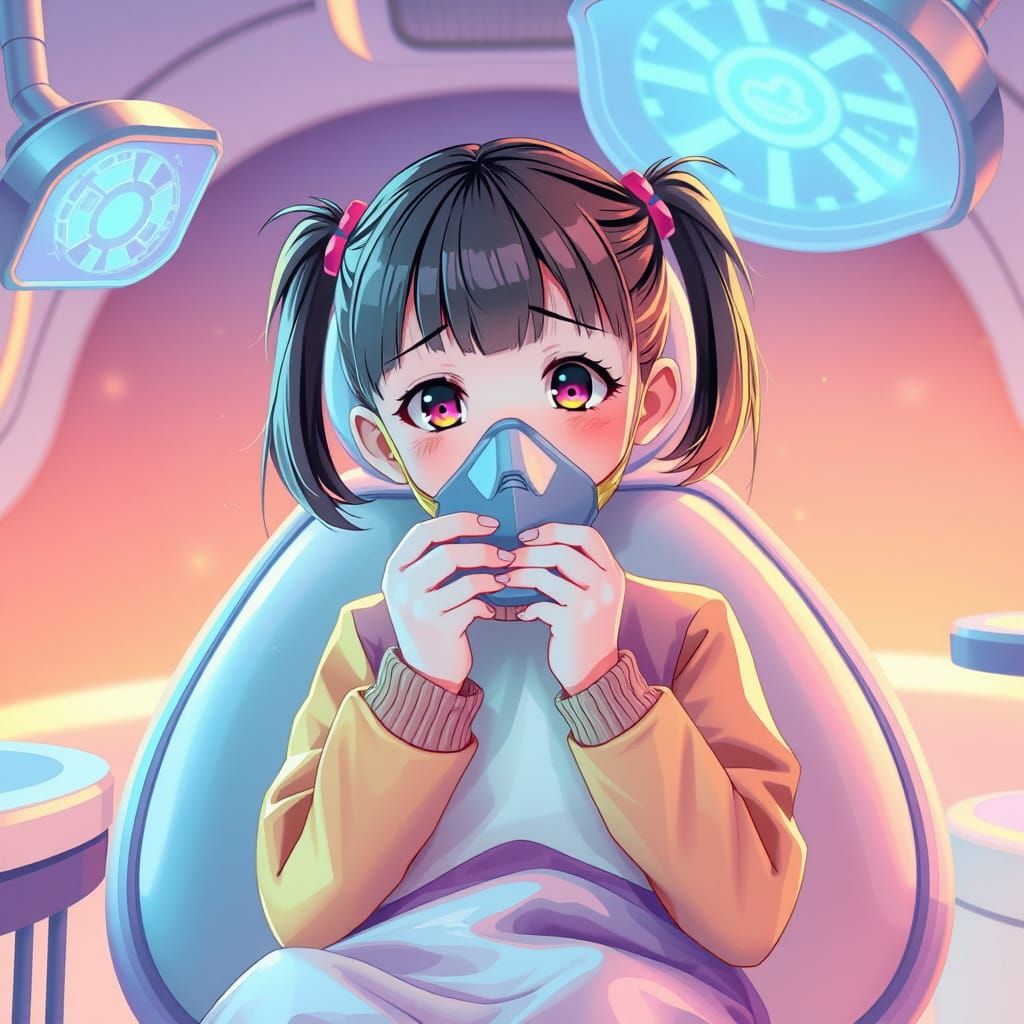 This image shows a young girl with pigtails and colorful clothes nervously sitting in a sleek futuristic dentist chair surrounded by holographic displays. The scene features soft warm light, gentle shadows, and vibrant pastel hues reminiscent of digital art and futuristic landscapes.