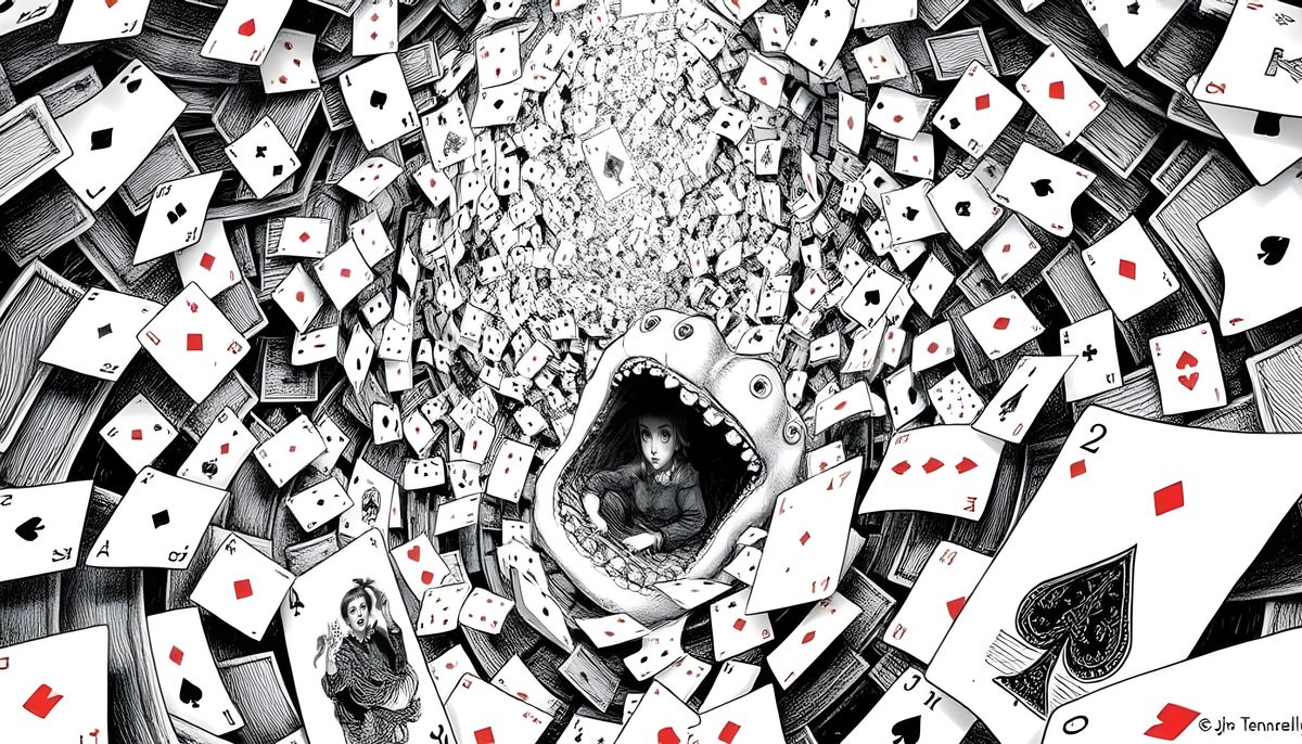 A hyperreal and hyperdetailed pen and ink drawing by john tenniel, with fish-eye lens distorted perspective like a drawing by m c escher, showing alice in wonderland being eaten by thousands of gigantic playing cards