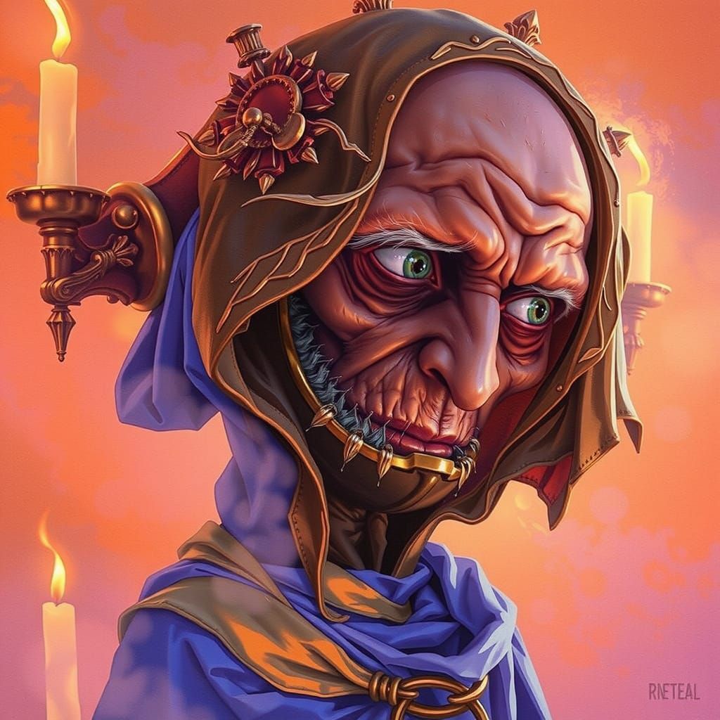 This image shows an elderly woman gazing into a mystical mirror in a dimly lit chamber. The scene is rendered with deep colors and intricate details, in a fantastical matte painting style.