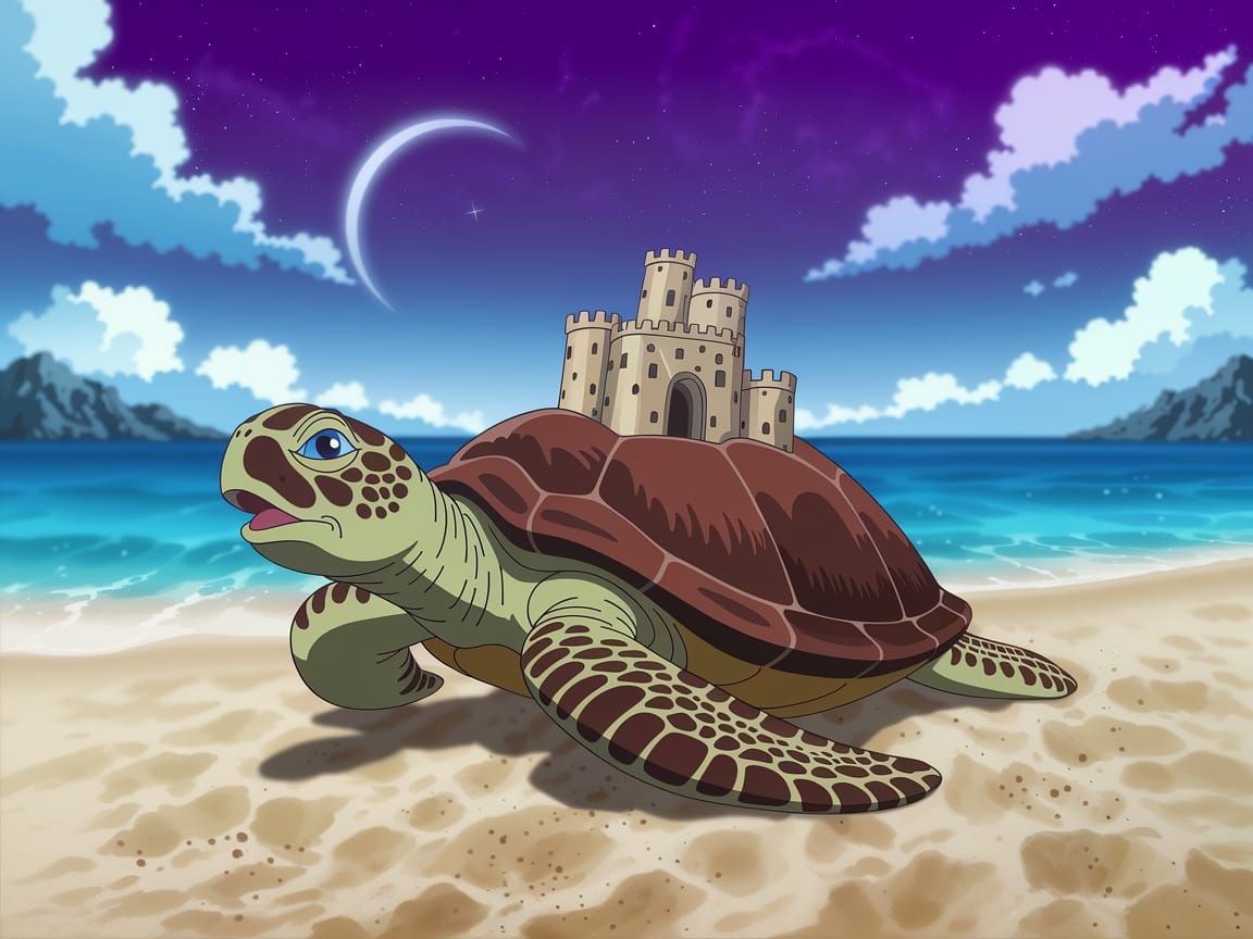 This image shows a singing sea turtle with a sand castle on its shell. The image is highly detailed with 3D shading, cel-shaded in 16k resolution as a cover art piece.