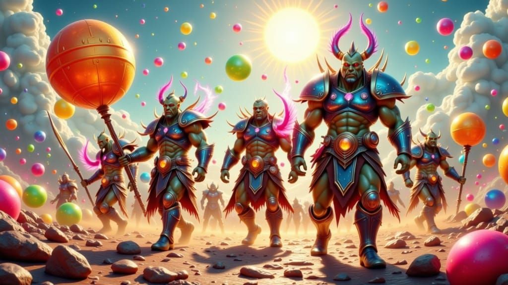 This image depicts a dynamic battle scene of orc warriors, clad in vibrant armor, wielding brightly colored bouncy balls as they clash in a sun-drenched landscape, surrounded by glossy, glowing acrylic hues reminiscent of futuristic and atmospheric styles.