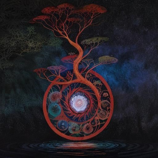 This image depicts a surreal scene with geometric and botanical elements. A woman stands in a lake, reflecting an ethereal landscape in watercolor style. The composition is intricate and visionary.