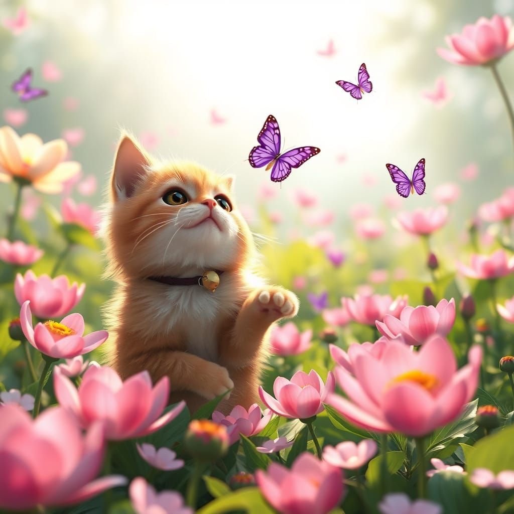 A vibrant image of an orange cat chasing butterflies in a lotus meadow. The scene is rendered as 3D anime art, with soft lighting and intricate textures, similar to a pixiv illustration.