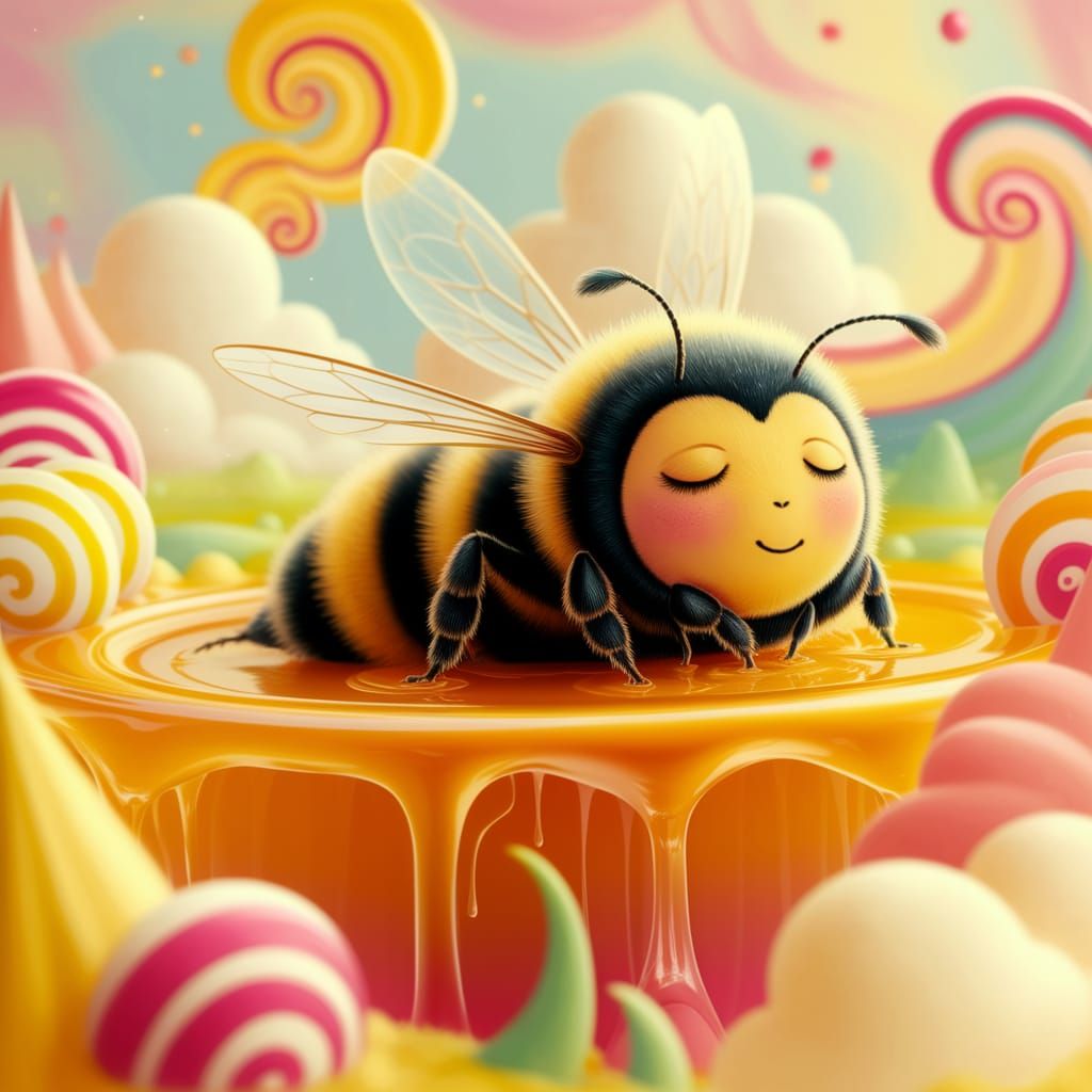 A charming image of a bumblebee asleep on honey in a colorful candy dreamscape. The scene is rendered in glowing colors and soft, swirling gouache.