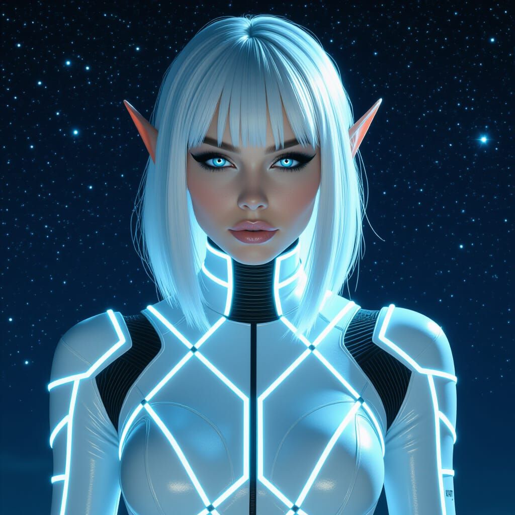 A photorealistic portrait of a futuristic elf in a white sci-fi catsuit against a starry sky. The image features intricate textures and details in a cyberpunk aesthetic.