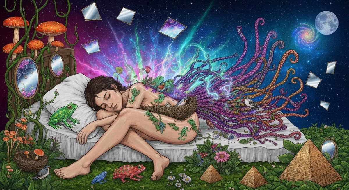 A striking picture of a sleeping person enveloped in an otherworldly aura. This bio-art collage, rendered with intricate detail, features glowing chameleons, swirling particles, micro plants and tribe patterns in a surreal atmosphere.