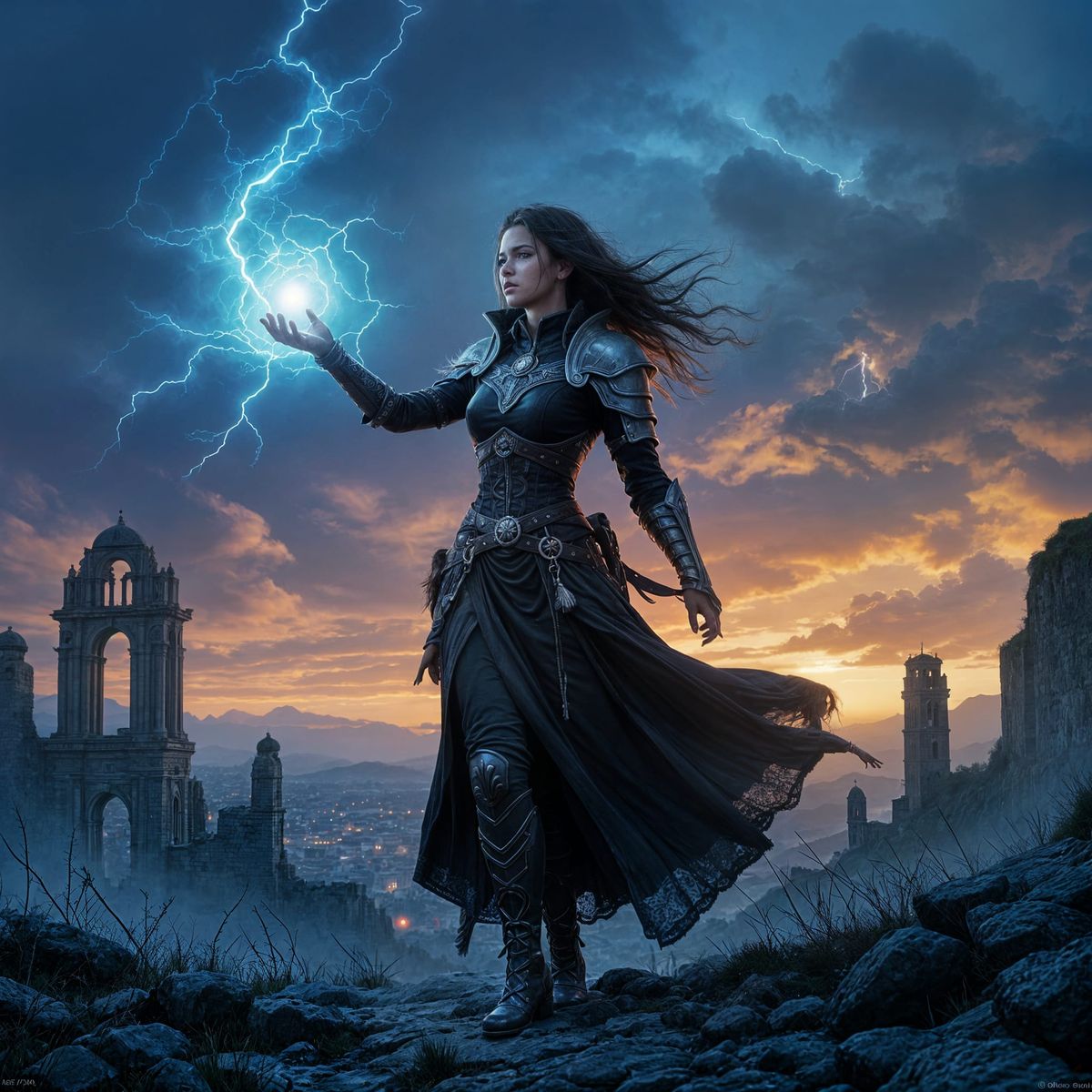 This image shows a powerful sorceress standing on a hill among gothic ruins at sunset. She wears a black combat robe and casts an arcane spell with blue and purple magical energy, in a dramatic, cinematic style.