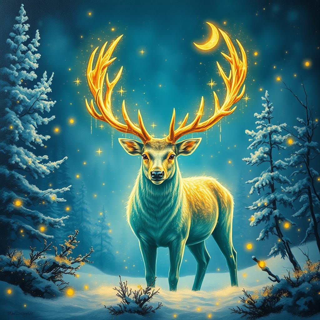 A striking picture of an aqua stag with golden antlers in an enchanted snowy forest. The stag is surrounded by fireflies and a golden moon, with aurora borealis effects in a soft ethereal style.