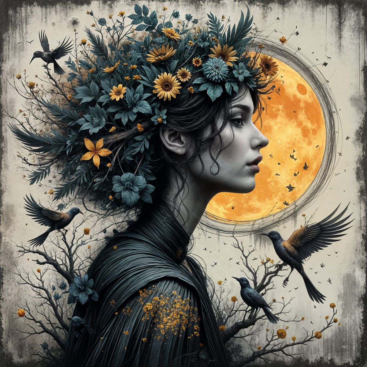 This image features a double exposure of a female face with whimsical birds and a full moon sky, presented in an Art Nouveau Punk style.