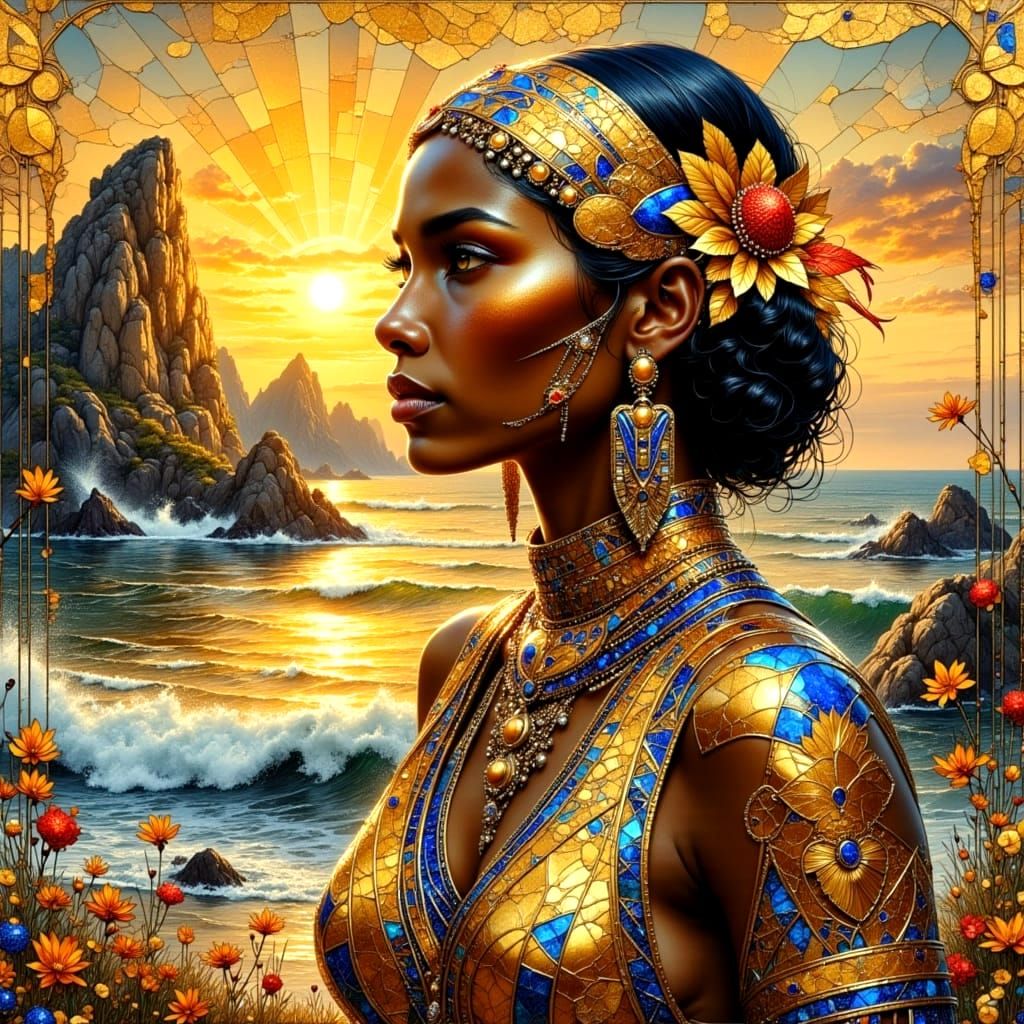 A stunning art deco-inspired seascape featuring a woman amidst a serene landscape, with soft colors and crinkled metallic textures.