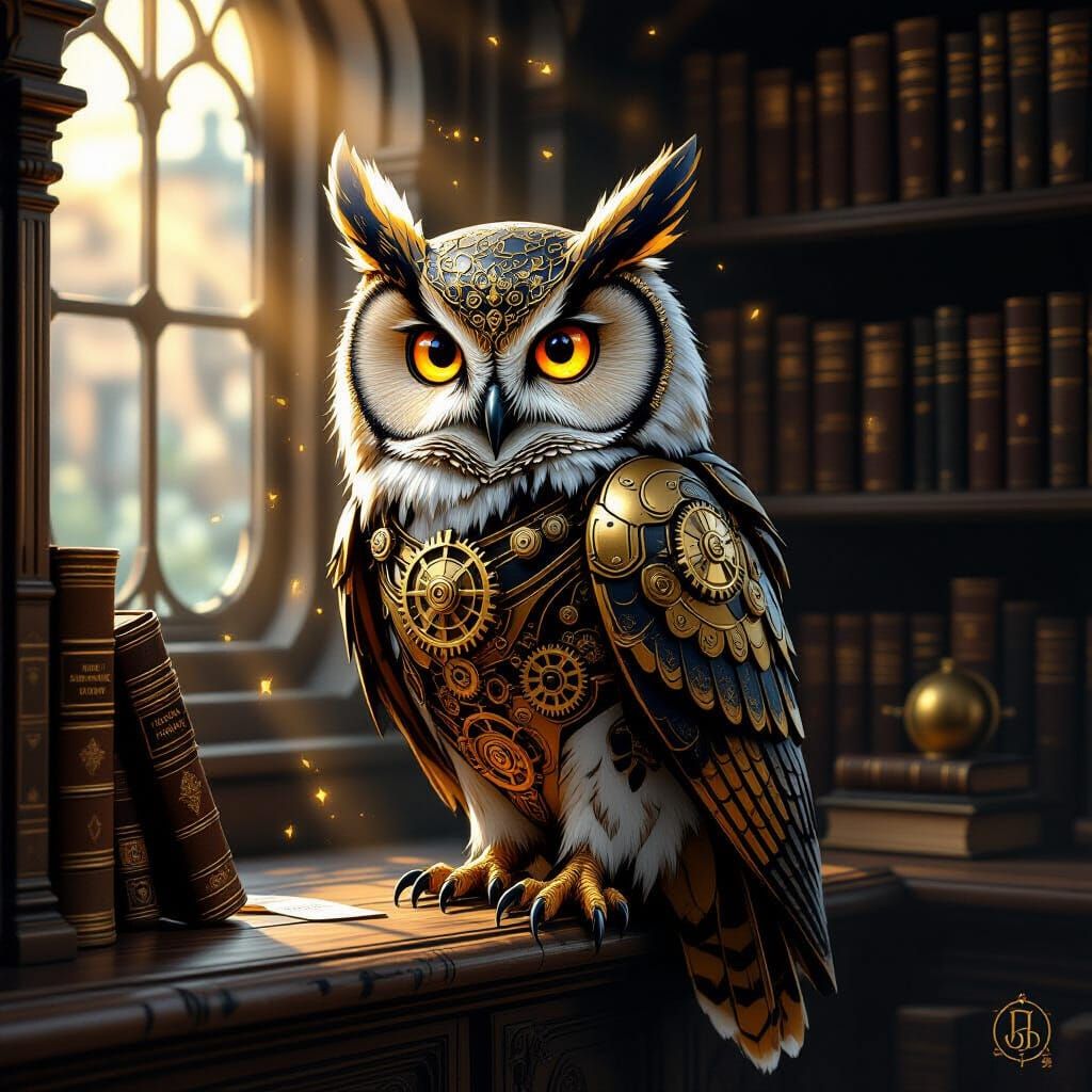 A majestic steampunk owl with brass gears and glowing eyes sits on an antique bookshelf. Captured in a detailed mechanical illustration style with sepia tones and atmospheric lighting.